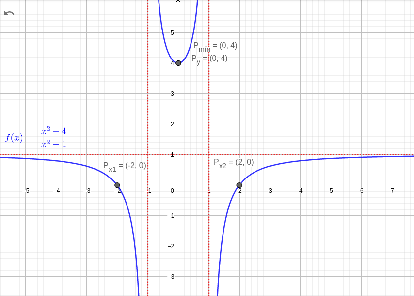 - \(D=\mathbb R-\{4\} \) També: \( D=(-\infty, 4) \cup (4, \infty) \)